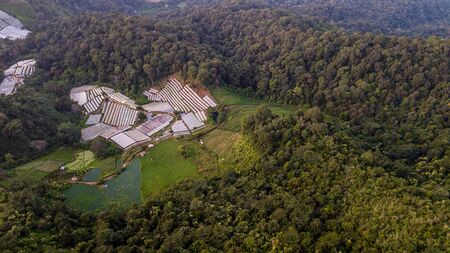 Fantastic landscape of Dalat Mountains, Viet Nam, fresh atmosphere, villa among forest, impression shape of hill and mountain from high view, wonderful vacation for ecotourism in spring.