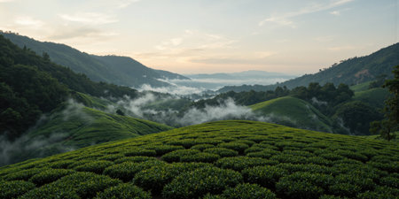 Capture the breathtaking beauty of a lush green hillside covered in an abundance of trees, creating a picturesque forest landscape, Tea estate slopes in the foggy morning sunrise, AI Generated