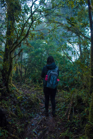 Alone man hiking enjoyment the morning mist in lush tropical rainforest.