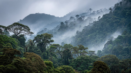 Misty Mountain Canopy: Serene Rainforest Retreat in South Asia with Breathtaking Aerial View of Exotic Jungle, Pristine River, and Lush Green Foliage