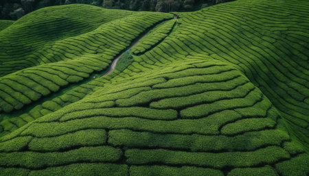 Wild Tea Terraces Dawn Minimalist aerial view of morning mist floating between ancient tea plantation rows creating abstract linear rhythm