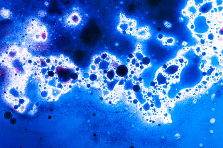 Art liquid. Bubble emulsion. Splatter pigment particles floating in grunge water. Gray black blue ink drop bursting mix blur abstract background.