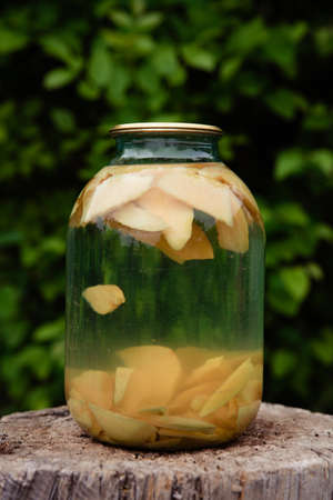 Canned quince fruit compote in a glass jar.Canned fruit compote against the background of nature.Organic homegrown produce