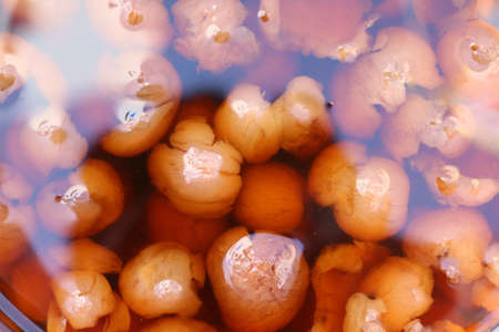 Jar with peas and foamed syrup. Harvesting for the winter. Harvest year and preservation of excess. Futuristic look evoking vivid emotions. Abstract wallpaper for kitchen dining room interior design.