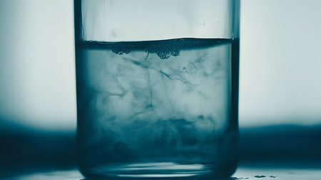 Close-up of a glass with ice cubes and liquid, cool blue tones, showing transparency and texture. Suitable for beverage, refreshment, or purity concepts.