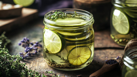 A vibrant jar of infused lemon water with fresh thyme slices, set on rustic wood. Perfect for wellness, freshness, and summer hydration.