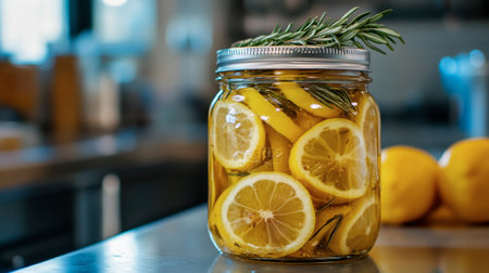A jar of preserved lemons, with slices of lemon and sprigs of rosemary visible, placed on a kitchen counter.