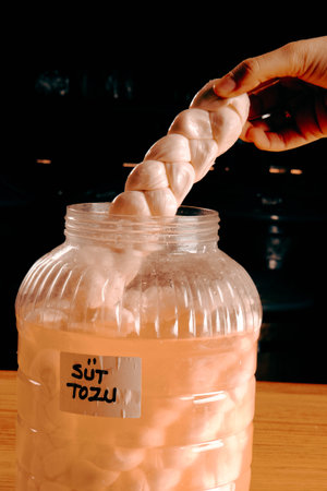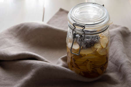 Jar of rye bread, hibiscus homemade kvass, kvass in process of making. High foam from sugar and yeast, rustic background. Slavic drink, closeup