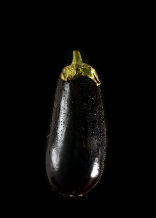 Fresh raw eggplant isolated on black background with small reflection on glass