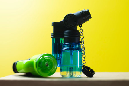 Bright yellow lighter with cap open on a red background for strong color contrast