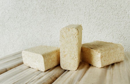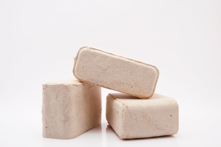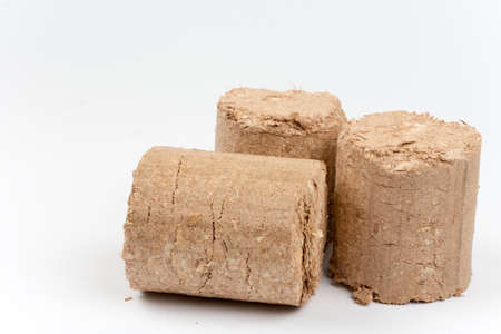 Three wooden briquettes made of pressed sawdust.