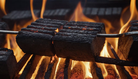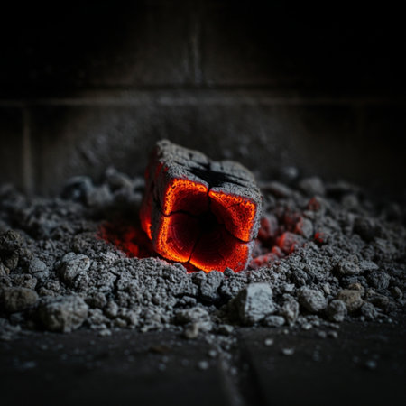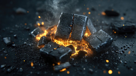 A striking image of burning charcoal blocks releasing glowing embers and smoke. The dark background enhances the intense heat and dramatic atmosphere.