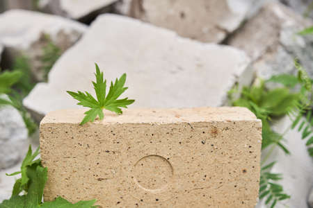 Beige stone platform on a stone background with a leaf of meadow geranium. A podium for your product. Copy space. High quality photo