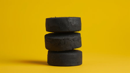 A minimalist image featuring a neat stack of round black spa stones set against a bold and vibrant yellow background, symbolizing balance.