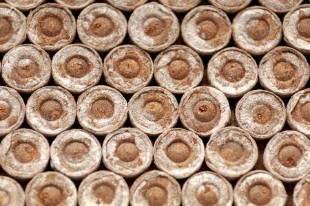 Compressed jiffy peat compost pellets tablets as background