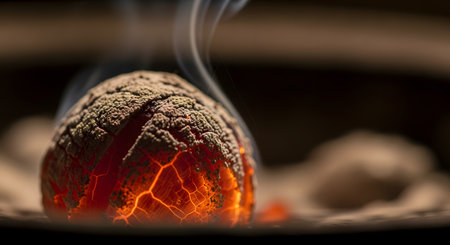 A mysterious, cracked spherical object smolders in the dark, its core glowing with the intense red-orange heat of embers, while wisps of smoke rise from its textured surface. This macro image evokes fantasy themes like a dragon egg, a cooling meteorite, or a magical artifact.