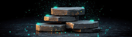 This captivating image features stacked stone blocks accentuated by glowing elements and sparkling dust on a dark background, creating a mysterious and futuristic atmosphere.