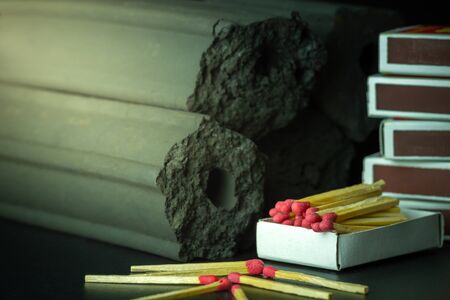 Box of matches and Carbon activated bamboo charcoal on dark background. Concept of fuel for living in the forest. Closeup and copy space.