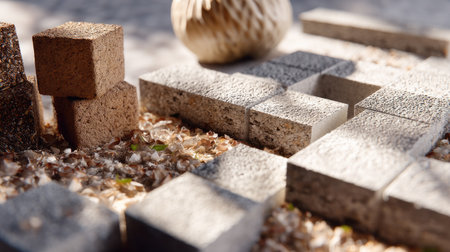This close-up image features textured building blocks arranged on a natural surface, illuminated by soft sunlight, showcasing creativity in outdoor design.