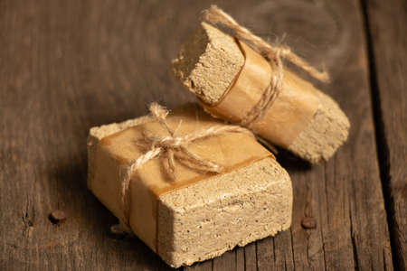 a piece of peanut halva on the table for breakfast, halva on the table