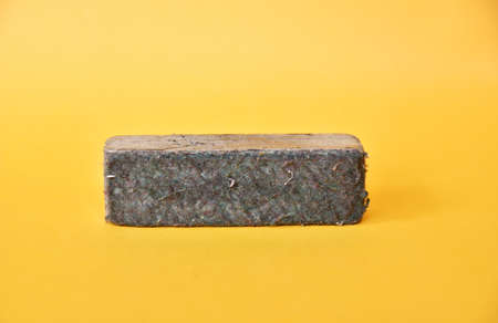soil texture close up. mock up. coconut briquette on a orange background.