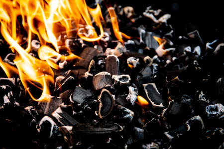 Close up shot of burning wood and charcoal used for barbeque