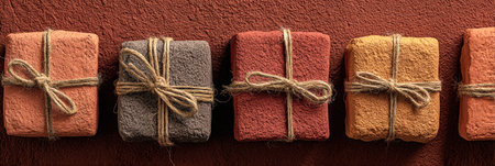 Colorful handmade soap bars tied with twine are neatly arranged on a textured surface, highlighting artisanal craft.