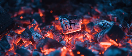 Black and white macro shot of burnt wood embers and ash with detailed textures Clear details and vibrant color...