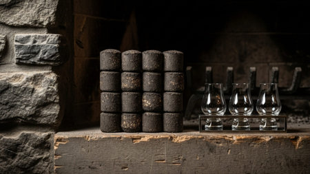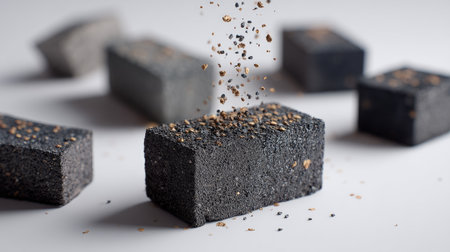 This striking image showcases dark textured bricks with scattered particles against a soft white background, highlighting details and depth in a minimalist style.
