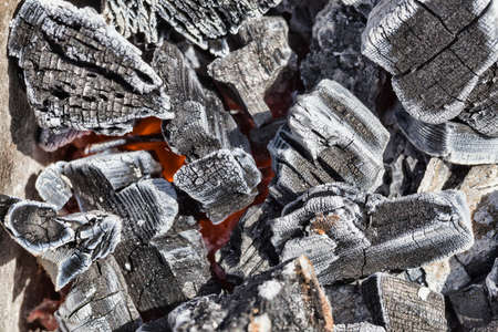 black white coals that remained after burning wooden boards and logs, close-up