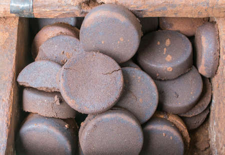 Wood briquette used for grilling meat. Pressed charcoal for smoking in the grill. Dark background.