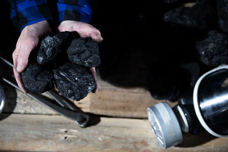 A miner holds small lumps of black coal in his hands over a wooden platform and a dust mask
