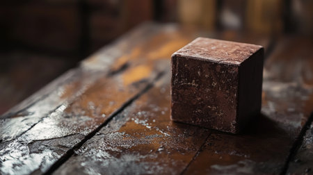 A rustic chocolate bar displayed on a textured wooden surface, emphasizing natural tones and handcrafted quality.