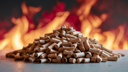 AI Generated. Pile of Natural Wood Pellets on a Surface with Flame Background