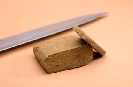 two portion hashish tablet with knife blade, brown background