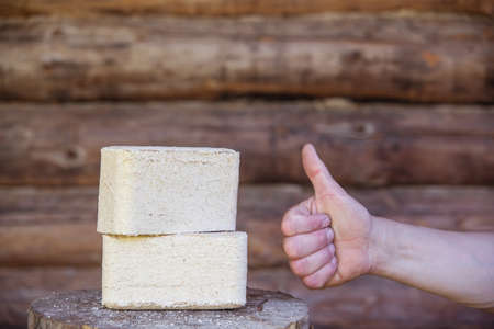 Fuel briquettes from pressed sawdust on a wood background. Human hand with a raised thumb.