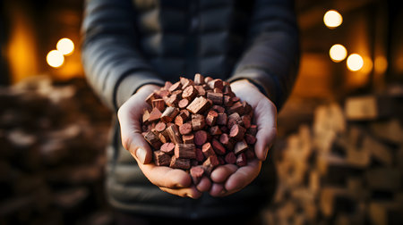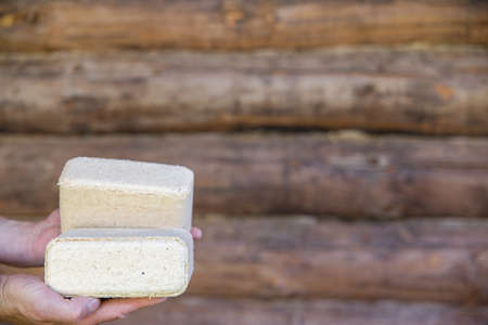 Hands hold fuel briquettes made from sawdust. Selective focusing on the briquette in the lower left corner of the frame.