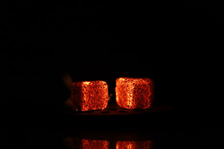 hot red coals for hookah shisha in a metal bowl with red blue neon lighting