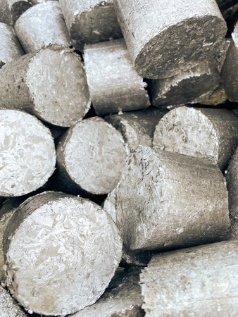 Aluminium compressed turnings called pucks ready to be remelted. High quality image.