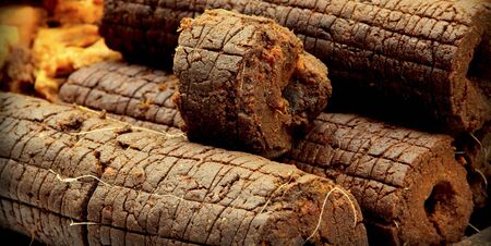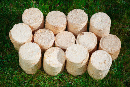 Alternative fuel, eco fuel, bio fuel. Wood sawdust briquettes for stoves. Lean-burn with good heat output. Briquettes from sawdust on a green background.