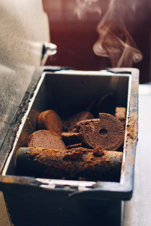 Shisha coal, charcoal pieces for water pipes closeup