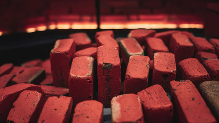 A close-up image shows a pile of red bricks near a blurred background of a glowing furnace.