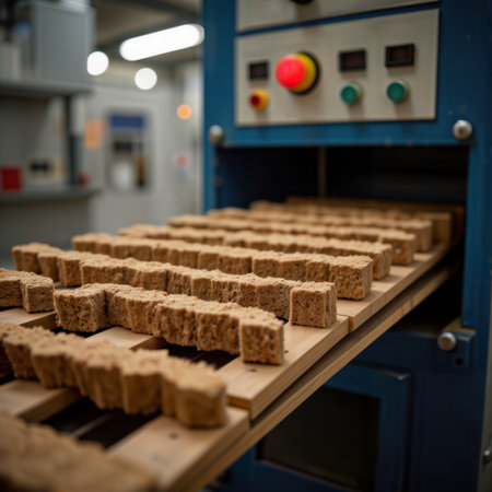 Small rectangular brown objects on a conveyor belt in a factory.