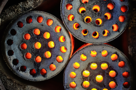 Black coal briquettes on metal grilles. Close up.