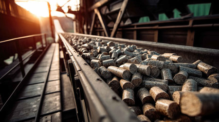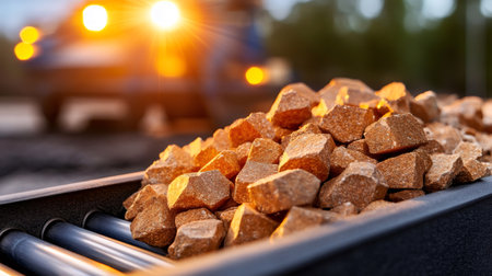 A stunning view of an industrial conveyor belt filled with materials at sunset, showcasing the essence of manufacturing and production in an outdoor factory environment.