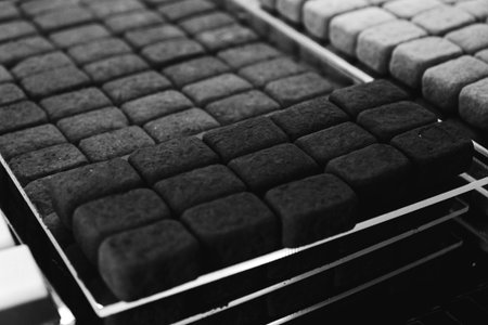 A close-up, black and white image of a pile of charcoal briquettes on ash. Clear details and vibrant colors en...