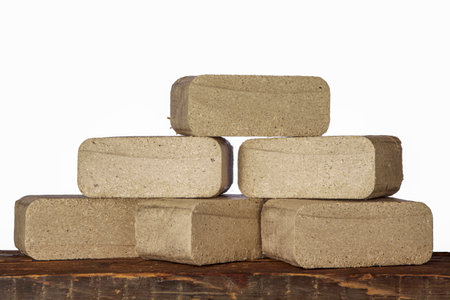 Wooden briquettes on wooden beams isolated against a white background