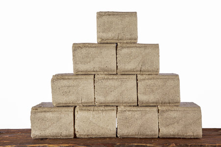 closeup of a pile of wood briquettes isolated on white background