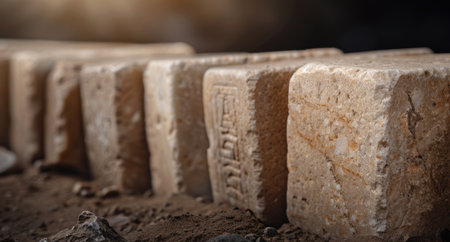 This captivating image features stacked stone blocks accentuated by glowing elements and sparkling dust on a dark background, creating a mysterious and futuristic atmosphere.