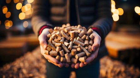 Pile of wood pellets in the hands of a female factory worker